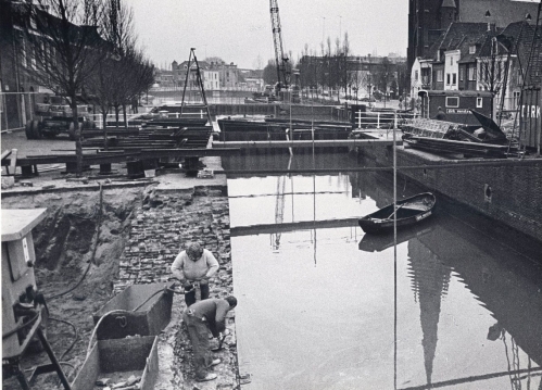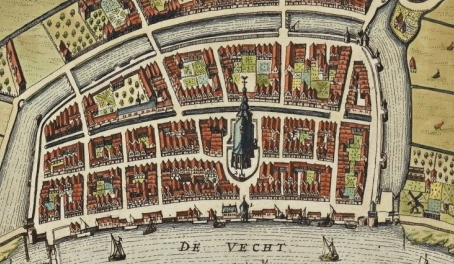 In de middeleeuwen stonden hier over de volle lengte aan de oever van de vecht houten huizen.