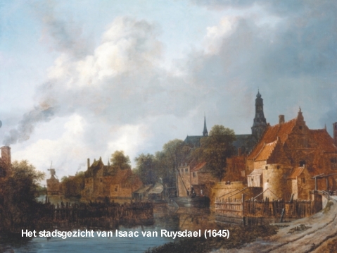 Op het schilderij ‘Het stadsgezicht van Isaac van Ruysdael (1645)‘ is duidelijk de plek te zien waar nu de Sluisbrug is ‘