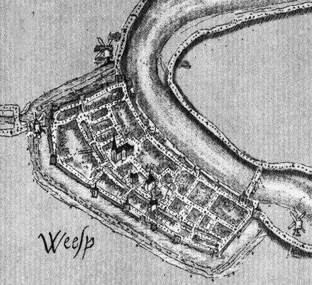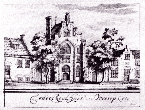 Midden onder op het plaatje hierboven (bij de letter V) ziet u ook het eerste stadhuis (het Regthuys) van Weesp.
