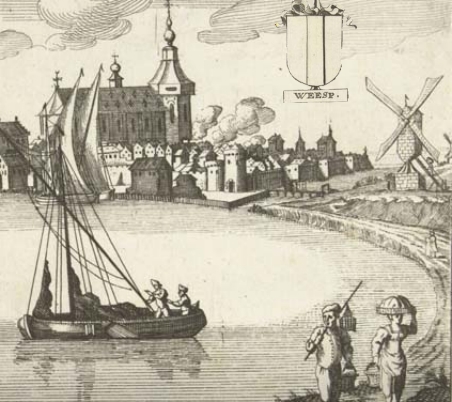 Op het schilderij gemaakt in 1657 van de schilder Jan van Beerstraten ziet u Weesp gezien vanaf de Stationsstraat.