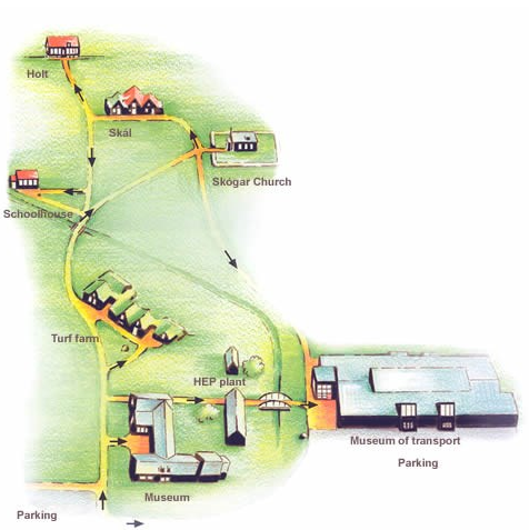 Het bovenste deel van het terrein omvat een schoolgebouw dat typisch is voor IJslandse plattelandsscholen uit het begin van de 20e eeuw, een kerk en een baðstofa gebouwd boven een veestal om te profiteren van de warmte van de dieren, samen met een pakhuis. Op het hoogste punt van het terrein staat een houten huis, gebouwd in Holt, Síða, in 1898.