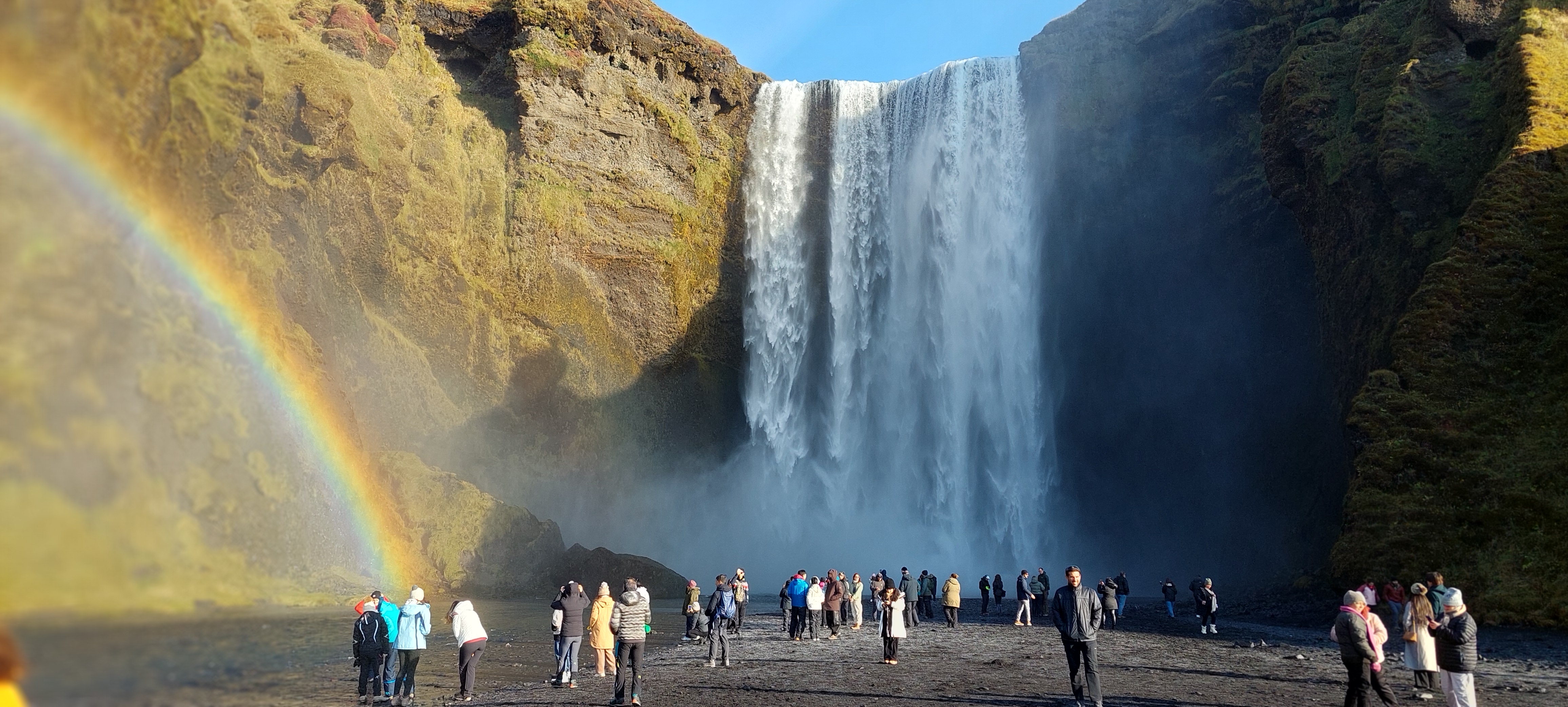 De Skógafoss waterval is een spectaculaire waterval in het zuiden van IJsland, niet ver van de plaats Skógar. Op deze plek stroomt de Skógá rivier over de kliffen, ongeveer 5 kilometer van de IJslandse kustlijn. De plek waar de rivier de Skógá over de kliffen stroomt was vroeger de kustlijn van IJsland.