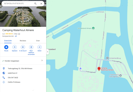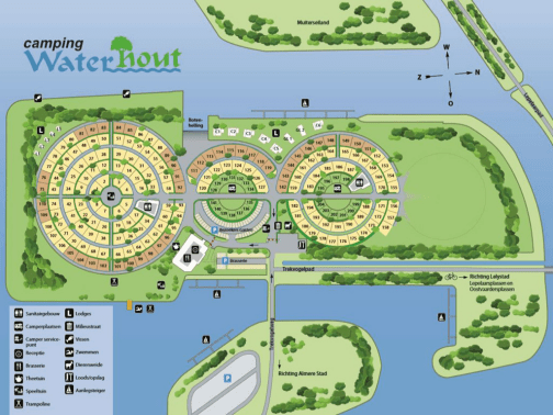 Camping Waterhout ligt op een eiland, het Schateiland, in een waterrijke groene omgeving. Dicht bij de Noorderplassen en de Oostvaardersplassen. In de jongste provincie Flevoland waarvan het laatste gedeelte pas in 1957 werd drooggelegd.